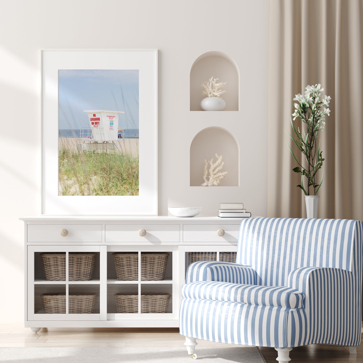 A quiet stretch of coastline, soft dune grasses, and a classic white lifeguard stand under a pale summer sky—this vertical beach print captures the laid-back charm of off-duty beach days. Shot along the Atlantic Coast on Tybee Island, Georgia the clean composition and bright tones make it a fresh addition to any space.