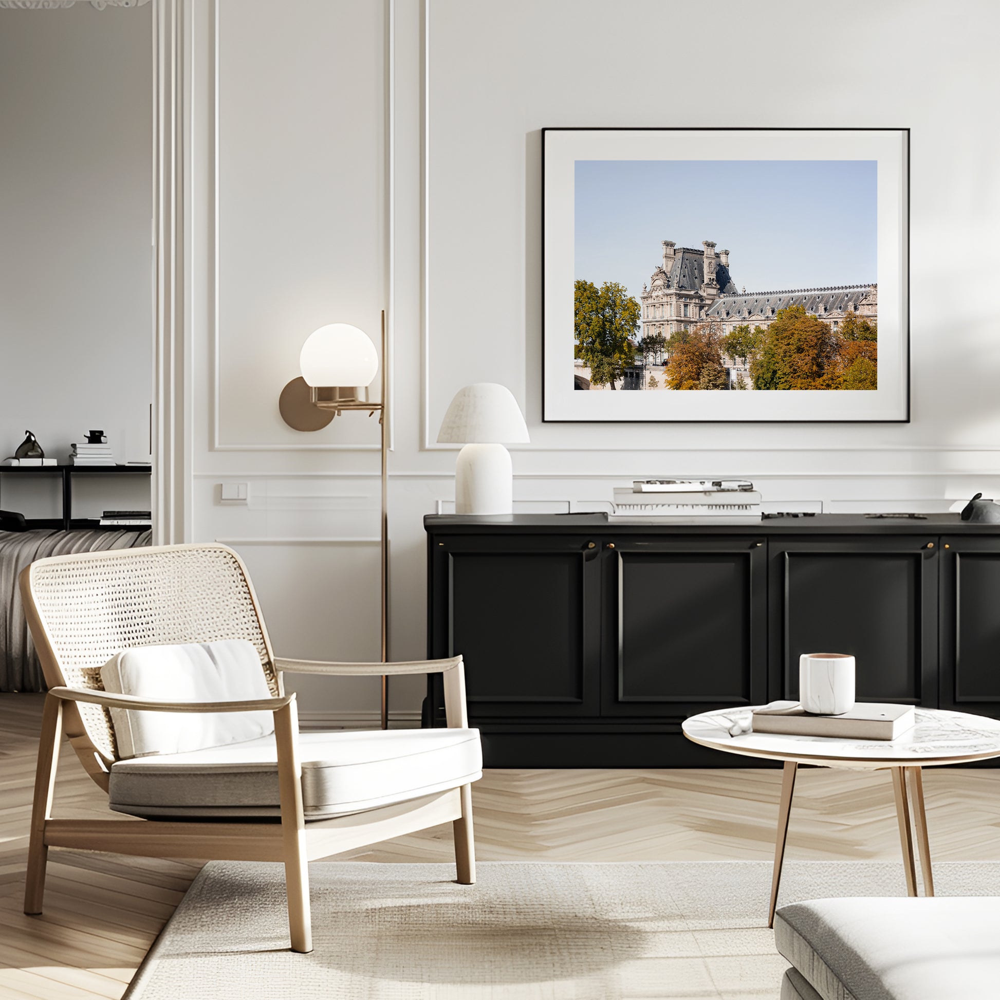 Beautiful neutral print of the Louvre Museum in Paris, France during the fall. The print has been edited with some film grain to give an airy effect as opposed to a very sharp photo. This architectural print will add an eye catching element to any room, be it the hallway, kitchen, bedroom, living room or guest room.